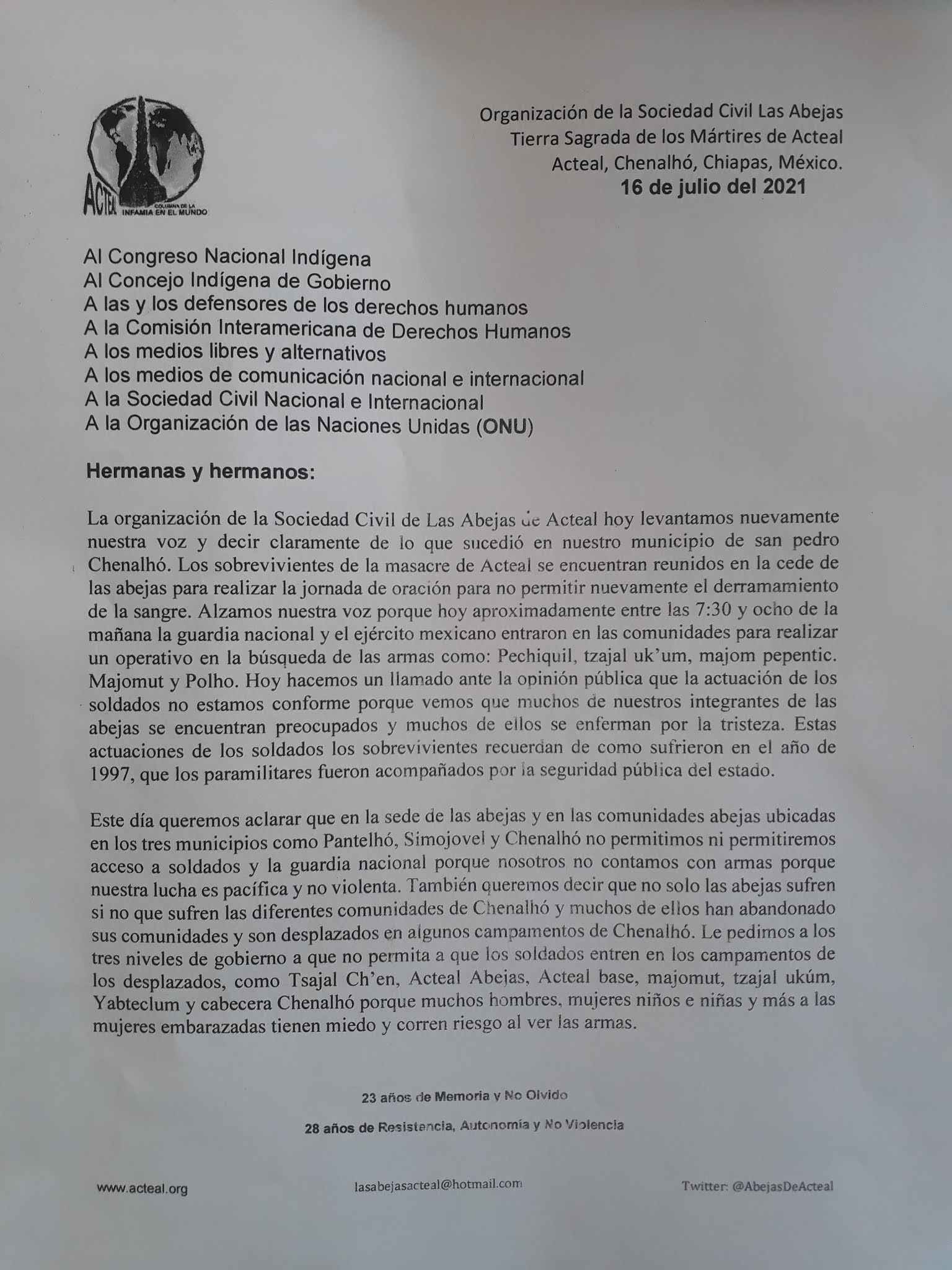 Nuestra sed de verdad y justicia nos ha convocado a nosotras y nosotros guardianes de la Memoria y de la Esperanza. Somos cuidadoras y defensoras de la vida las y los miembros de la Organización Sociedad Civil Las Abejas de Acteal. Y hoy en esta Tierra sagrada, nos encontramos concentrados para cerrar una jornada de ayuno y oración que iniciamos desde este jueves en las diferentes comunidades que conforma nuestra Organización, para pedirle a Dios Padre-Madre que nos dé fuerza y nos guíe en el camino de la paz y de la justicia ante tanta oscuridad y violencia desmedida en estas tierras tsotsiles.