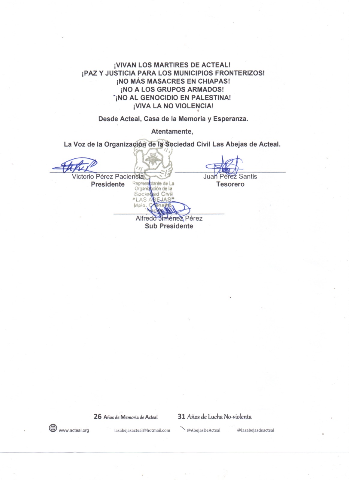 Desde el Campamento Civil por la Paz de Nuevo Yibeljoj, perteneciente a la Organización Sociedad Civil Las Abejas de Acteal; a 30 de septiembre de 2024.